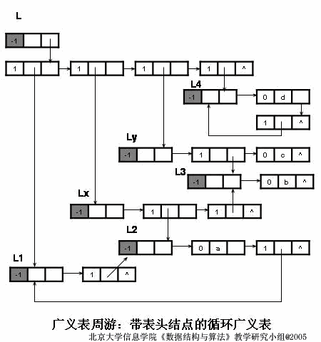 广义表周游的时候应该注意几个问题:相当于深度优先周游;访问的时候首先进入一个子表的头结点,设置mark标记;按照本层子结点顺序,访问广义表,如果是子表结点,则准备递归地访问此子表表头结点,如果是原子,则直接访问;避免进入循环链中无法跳出,mark用来防止循环访问而设置的访问位,实际上,表头结点才需要mark。
